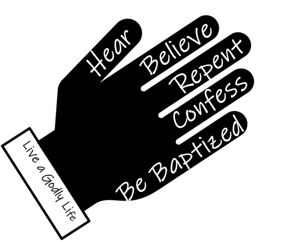 | Hear—Have I heard and understand the gospel? Believe—Do I believe in God and in his son Jesus? Do I believe that he is the only way to God?Repent—Am I ready to live my life walking towards God and not to- wards sin? Confess—Can I confess that Jesus is the Lord and that I need him to save me from my sin? Be Baptized—Am I ready to bury my “old self” and raise to a new life? To be forgiven of my sin and have the gift of the Holy Spirit? Live a Godly Life—Am I ready to live every day for Jesus? Am I willing to develop good behaviors that will help me grow in my faith? |
